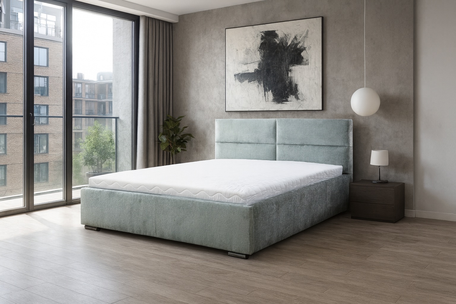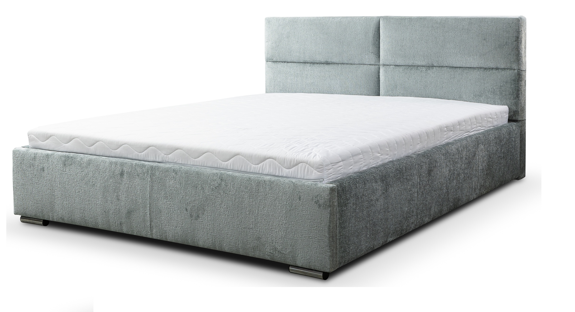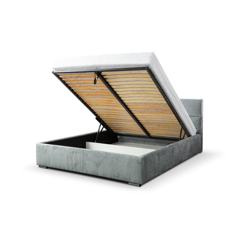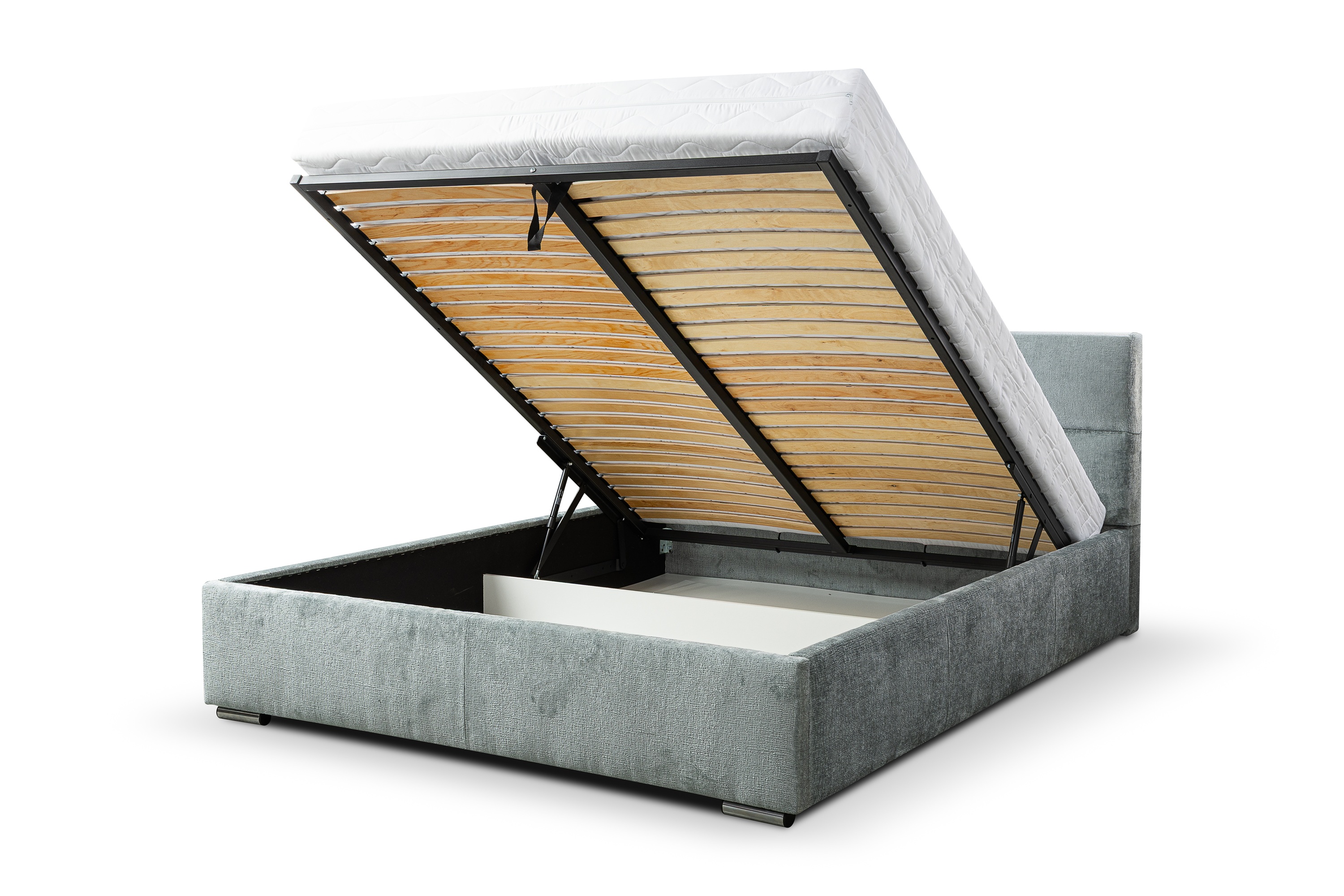 Łóżko tapicerowane z zagłówkiem wykonanym z czterech paneli tapicerowanych. Łóżko Carlo wyposażone jest w pojemnik na pościel otwierany do góry, ilość miejsca w pojemniku pozwala na umieszczenie dużej ilości pościeli czy innych rzeczy. Stelaż do łóżka w zestawie, metalowa rama z poprzecznymi drewnianymi listewkami gwarantuje stabilność całej konstrukcji.