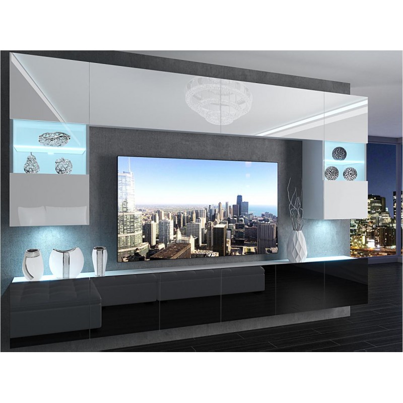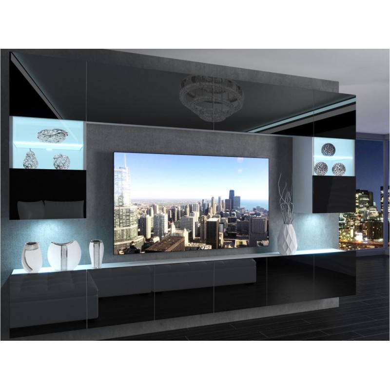 Przedmiotem sprzedaży jest rewelacyjna i niezwykle elegancka meblościanka, która wkomponuje się do każdego nowoczesnego salonu nadając mu nietuzinkowy wygląd. Meblościanka skomponowana jest tak, aby pomieścić duży sprzęt telewizyjny w centralnej jego części, po bokach umieszczone są przeszklone półki, które robią piorunująco dobre wrażenie w połączeniu z oświetleniem LED.