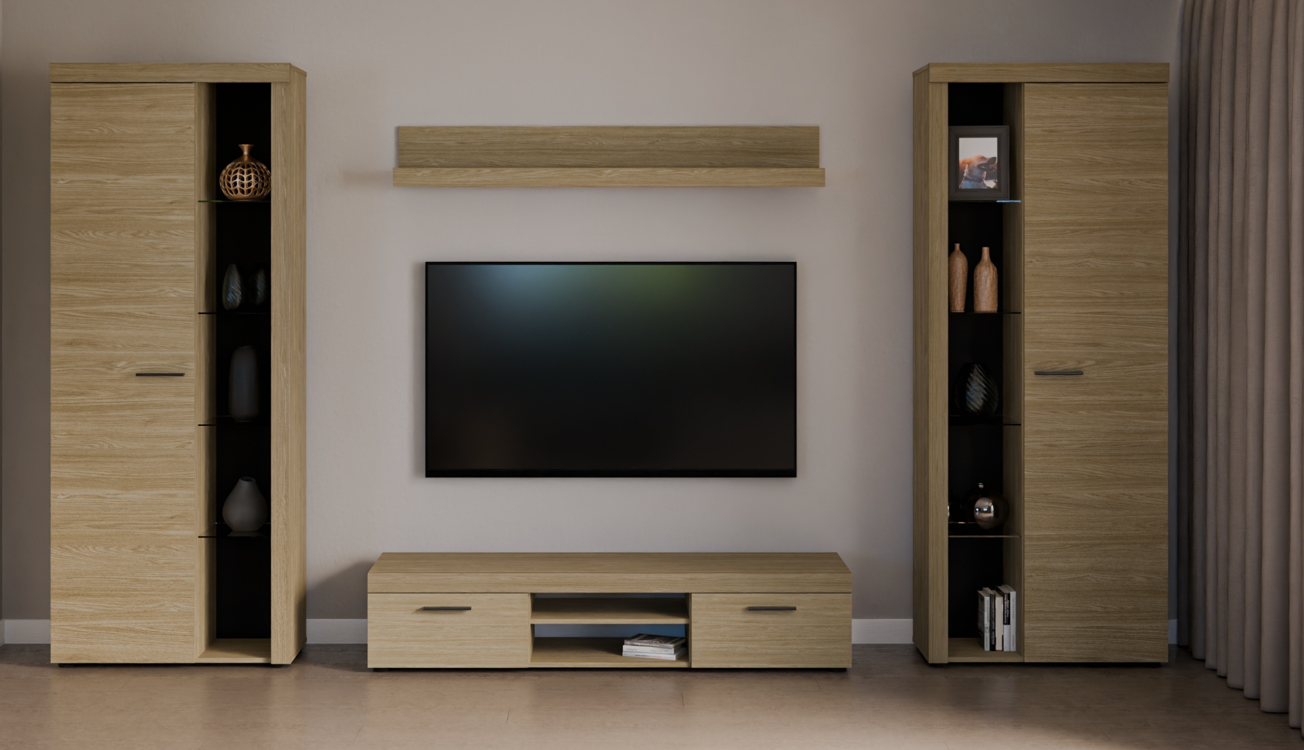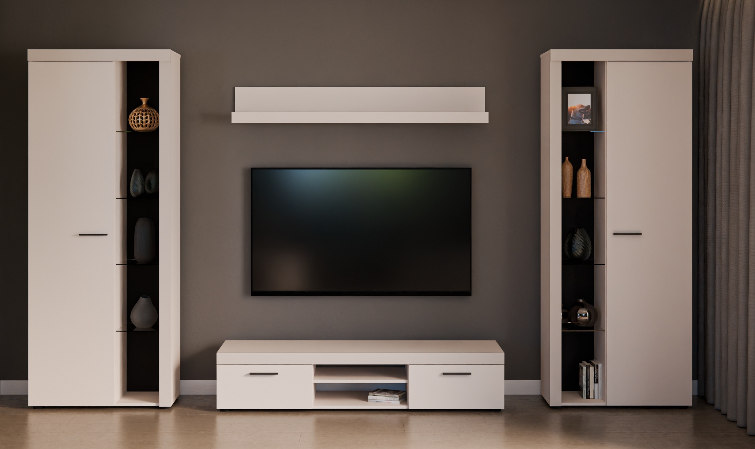 Meblościanka łączy w sobie modne wzornictwo, eleganckie kolory oraz minimalistyczne formy. Dzięki temu świetnie komponuje się zarówno w małych, jak i większych salonach, dodając im lekkości i eleganckiego charakteru. Zestaw został wykonany z wysokiej jakości płyty laminowanej, odpornej na zarysowania, wilgoć i codzienne użytkowanie. Trwała konstrukcja i precyzyjne wykończenie sprawiają, że meble będą służyć przez wiele lat.