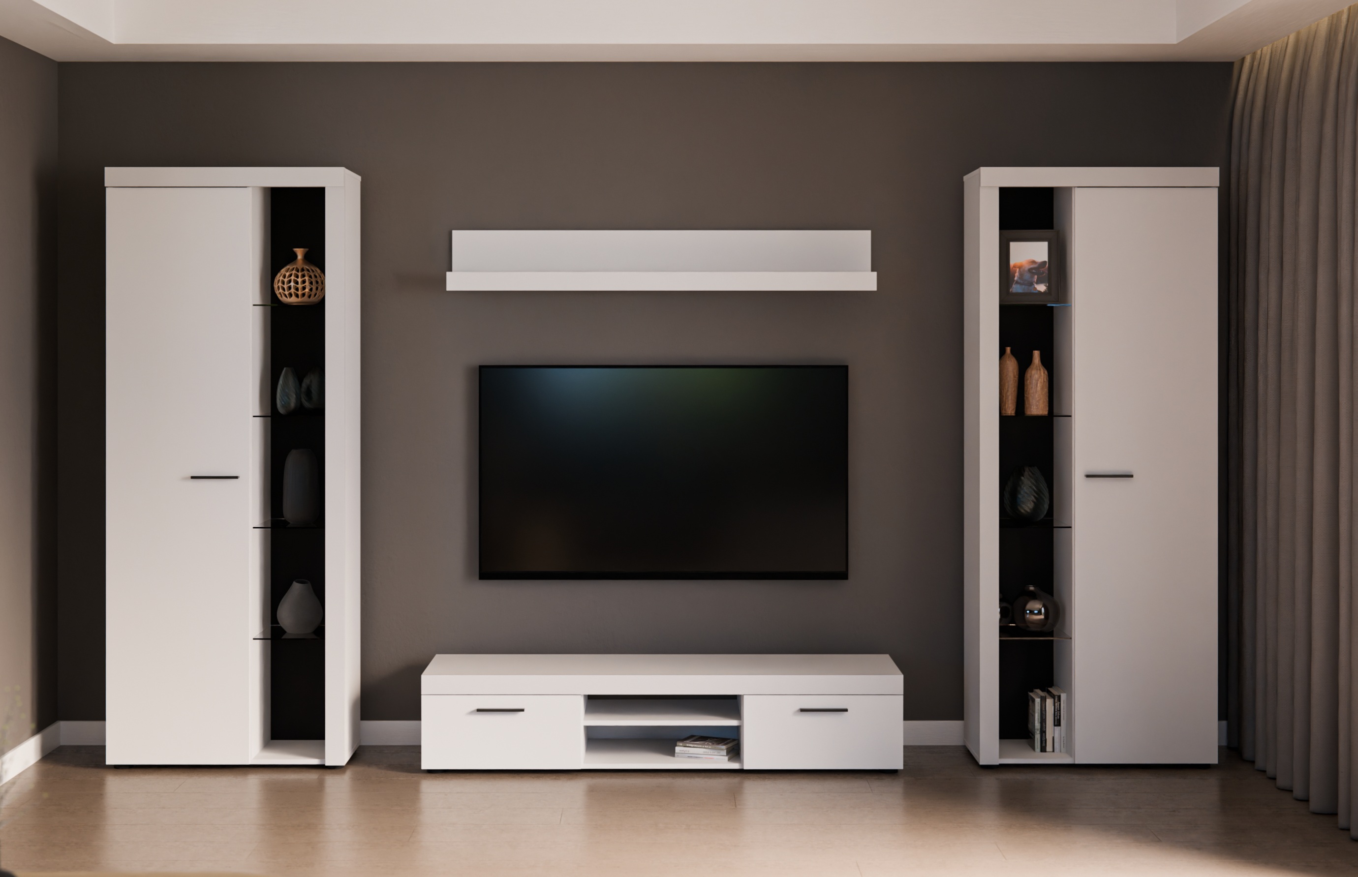 Szukasz praktycznych i stylowych mebli, które odmienią Twój salon? Nowoczesna meblościanka z szafką RTV i witrynami to idealny wybór do wnętrz urządzonych w każdym stylu – od minimalistycznego po klasyczny. To funkcjonalny zestaw, który zapewni Ci dużo miejsca do przechowywania, jednocześnie dodając wnętrzu elegancji i harmonii. Meble dostępne w pięciu kolorach do wyboru aby idealnie się wkomponowały do każdego wnętrza domu czy mieszkania.
