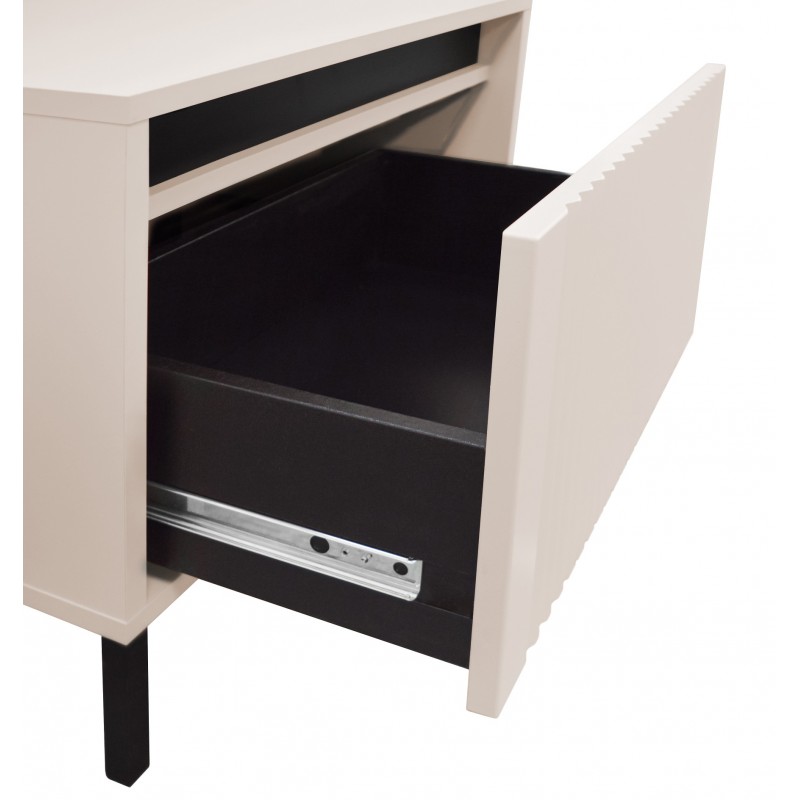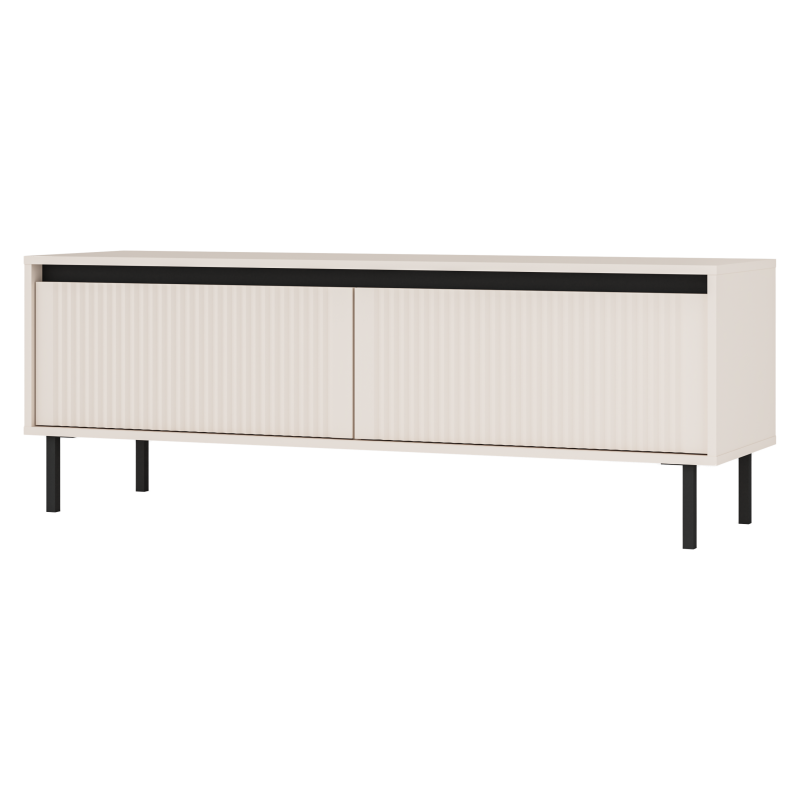 Szafka rtv Kaja to niezbędny element każdego salonu czy pokoju gościnnego, Solidny blat na którym swobodnie postawisz telewizor oraz sprzęt multimedialny. Dwie wysuwane szuflady na prowadnicach kulkowych ułatwią przechowywanie gier lub innych przedmiotów aby panował ład i porządek każdego dnia. Uwagę przykuwa jej piękny wygląd, front wykonany z płyty MDF frezowany pionowo nadający meblu nowoczesnego designu. Korpus z wysokiej jakości płyty laminowanej która jest odporna na uszkodzenia i pęknięcia. Całość osadzona na wysokich czarnych nogach które podkreślają bryłę szafki.