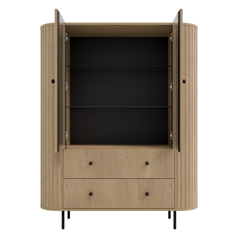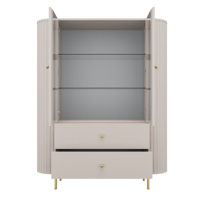 - wysoka witryna dwudrzwiowa z przeszklonymi drzwiczkami dzięki którym wyeksponujesz różne przedmioty, w dolnej części dwie wysuwane szuflady.
